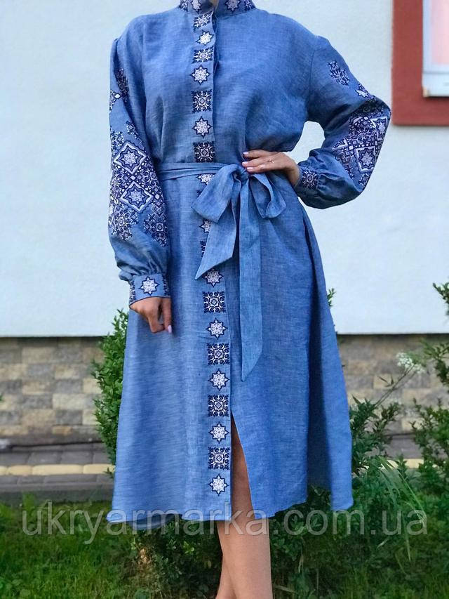 Витончене плаття джинсового кольору з геометричною вишивкою та вишитим поясом надає образу легкості та загадковості. Горловина зроблена стійкою, перед сукні вишита планка з прихованими гудзиками (кнопками)