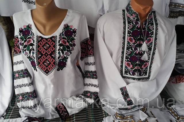 Комплект вишитих сорочок для пари, в ній гармонійно поєднується квітковий та геометричний орнаменти