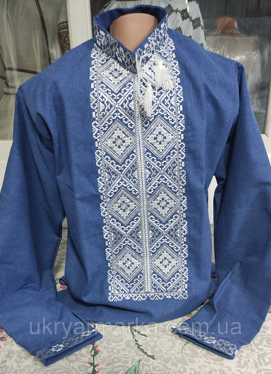 Елегантна вишита сорочка на льоні джинсового кольору вишита білою ниткою.