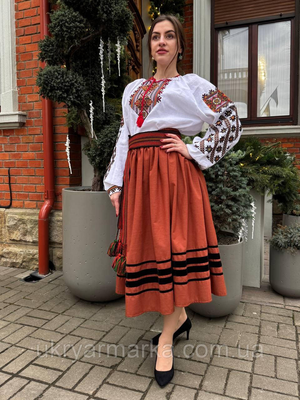 Якщо хочеться яскравого настрою - вдягай яскраві речі! Спідниця яскравого коричнево-теракотового кольору, довжиною за коліна, виготовлена з льону, чудово поєднує стиль та комфорт. Її елегантний вигляд доповнюють чорні велюрові стрічки різної ширини, які декорують низ спідниці та додають їй витонченості та оригінальності. Українська спідниця в етнічному стилі відмінно пасує до сорочок Прикарпаття, в гуцульському стилі, на бежевому та білому полотні, льоні. Довгий пояс, що плавно підкреслює талію, приховує резинку і, немов елегантний акцент, завершить образ, надаючи йому гармонії та жіночної витонченості. ЗВЕРНІТЬ увагу, що тканий пояс - крайка з китицями, до комплекту не входить, його можна придбати додатково. Ця спідниця - не просто річ у гардеробі, а справжня частинка мистецтва, що втілює поєднання традиційної краси та сучасного стилю. Довжина - 80 см. Довжину спідниці можна корегувати за бажанням клієнта. Тканина - якісний сумішовий льон (льон, бавовна, віскоза). Колір тканини - коричнево-теракотовий.
