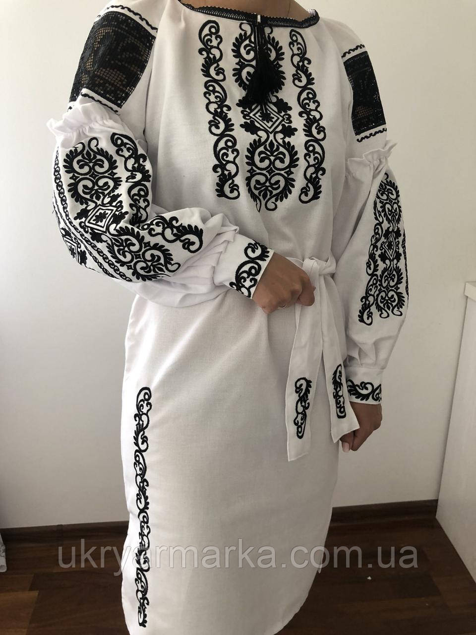 Чудесна ніжна вишита сукня в українському стилі із рослинним орнаментом у чорних тонах. Рукав реглан добре лягає по плечам. Широка філейна мереживна вишивка плаття вишиванки надає повітряності і легкості