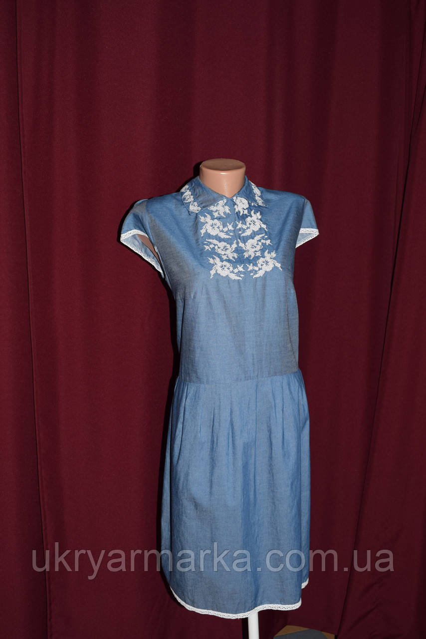 Літній сарафан з вишивкою білими нитками. Пошив сукні та комірець дозволяють одягати такий сарафан як на свята, так і на роботу. Тканина - тонкий джинс займає лідерські позиції при пошитті виробів для повсякденного, зручного та практичного носіння.