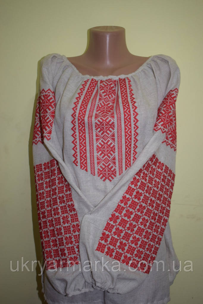 Вишита блуза займає поважне місце в гардеробі кожної модниці. Таку сміливо можна одягати на святкування чи просто на роботу. Сорочка прямого пошиву на довгий рукав з яскравою червоною вишивкою спереду сорочки та на рукавах. Ця блузка ідеально підійде для впевнених в собі жінок.