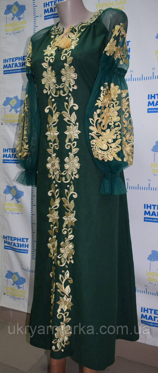 Прикрасою цієї максі-сукні служить витончений складний золотистий візерунок на передній частині і по рукавах, талія красиво підкреслена широким поясом. М'яко струмуючий льон обкутає та захистить Вас. Рукави напівпрозорі нададуть образу романтичності та загадковості. Вони теж химерно та складно вишиті. Заставлять не просто звернути увагу на власницю шикарної комбінованої сукні бохо, а й глибоко закарбувати в пам'яті яскравий портрет.